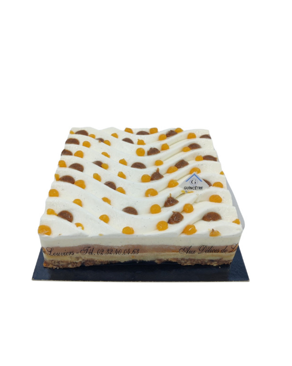 Croustillant amande, Biscuit crémeux vanille, crémeux praliné noisettes, compoté abricot, mousse vanille