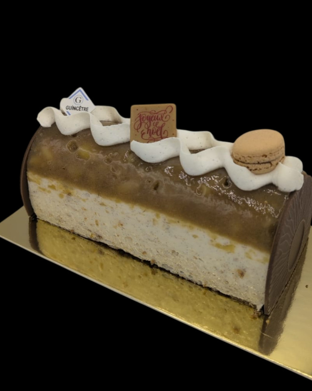 Croustillant feuilletage, Biscuit caramel, Crémeux Caramel, Compotée pomme Granny, Crème mille feuille vanille.
