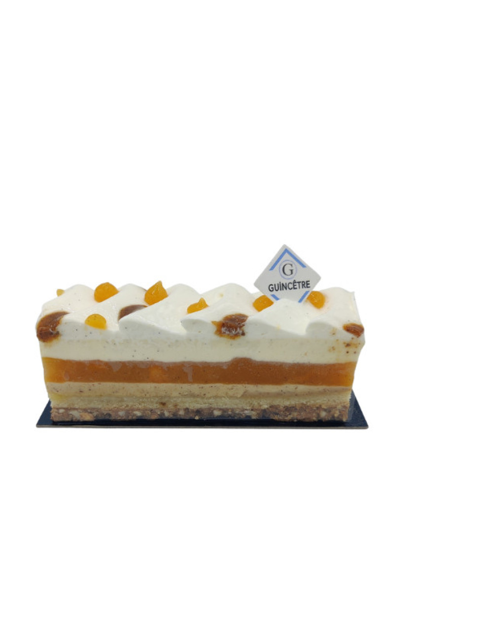 Croustillant amande, biscuit crémeux vanille, crémeux praliné noisettes, compoté abricot, mousse vanille